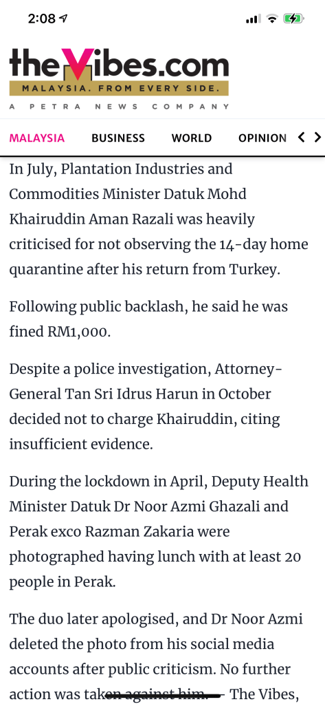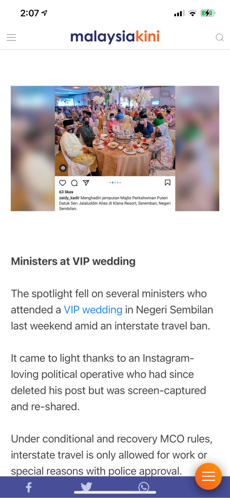 “Malaysians are also frustrated and discontented with the perceived inconsistent enforcement of the SOP, where hefty fines are issued immediately to laymen for breaching the SOP, while VIPs get away scot-free.”