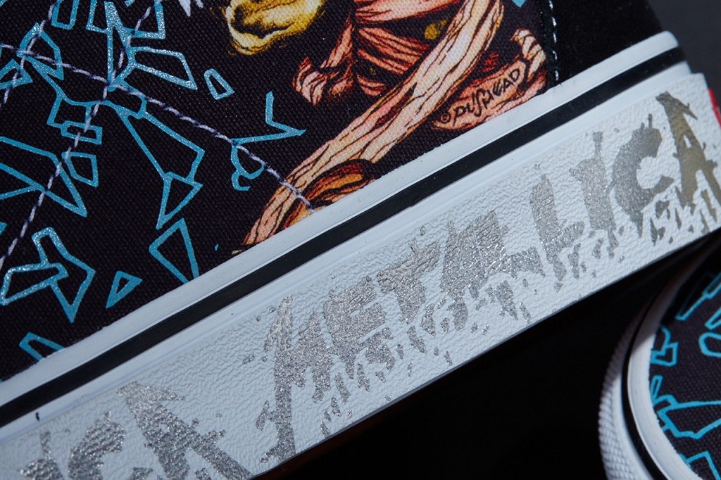 Pushead’s signature “Sad But True” design is associated with Metallica’s Black Album era, with the twin skulls artwork appearing as part of the band’s set design as they toured the world. The facing skulls appear on the two silhouettes, including their use on the quarter panels on the Sk8-Hi. The Classic Slip-On, on the other hand, places them on opposing shoes. Other features of the collaboration include a graphic blue shatter design, silver Metallica branding and a printed Metallica logo on the heel stay.